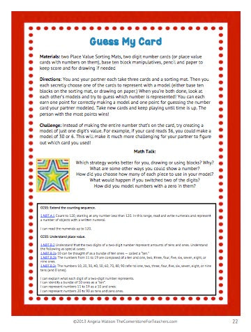 * 14 pages of game instructions: there's one page for each game, featuring the materials needed, directions for gameplay, a Challenge activity, Math Talk