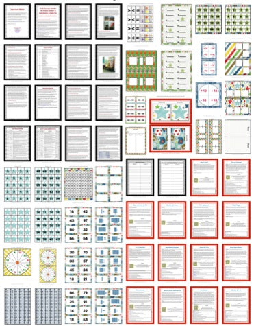 * 32 pages of sports-and-stars-themed game boards, cards, and other colorful and fun materials for gameplay. Most of the materials are open-ended and can be used in lots of different ways so you have fewer items to print and create. The only additional items you need to provide are page protector sheets and Vis-à-vis or dry-erase markers, dice, and base ten block manipulatives.