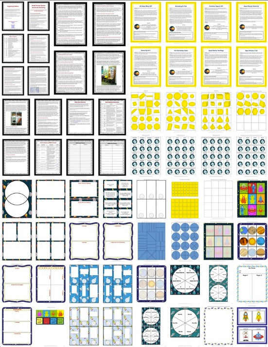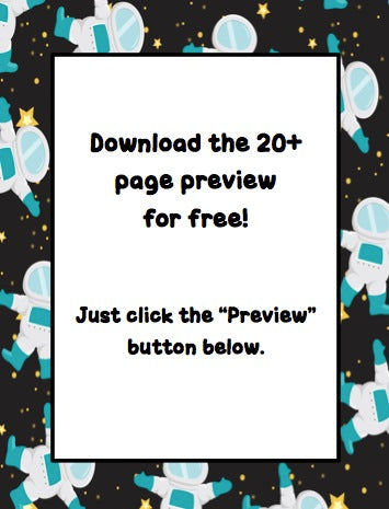 * 40 pages of outer space-themed game boards and mats, game cards, spinners, and other colorful and fun materials for gameplay. Most of the materials are open-ended and can be used in lots of different ways so you have fewer items to print and create. The only additional items you need to provide are page protector sheets, Vis-à-vis or dry-erase markers, and paper clips to make spinners.