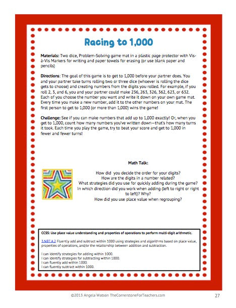 * 12 pages of game instructions: there's one page for each game, featuring the materials needed, directions for gameplay, a Challenge activity, Math Talk