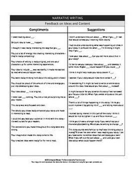 This document contains hundreds of comment suggestions to help you give meaningful feedback to students on their writing assignments. You can use these comments to help guide your conversations during writing workshop and writing conferences. Or, use them in your written feedback at the top of student work or on sticky notes. These comments can also be used to help describe student writing for portfolio assessments, progress reports, report cards, or in parent conferences.