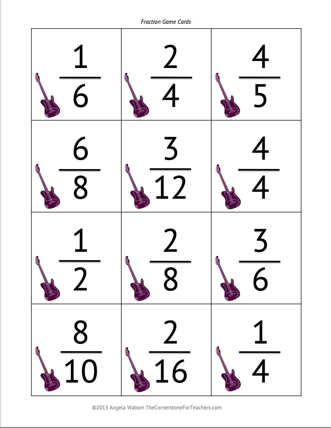 * 30 (or more) pages of rockstar/music-themed game boards and mats, game cards, spinners, and other colorful and fun materials for gameplay. Most of the materials are open-ended and can be used in lots of different ways so you have fewer items to print and create. The only additional items you need to provide are page protector sheets, Vis-à-vis or dry-erase markers, paper clips to make spinners, and some sort of fraction manipulatives (like fraction bars or strips).